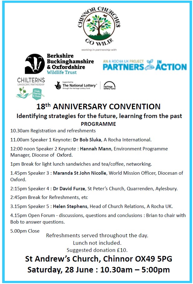 Chinnor Churches Go Wild (CCGW) is celebrating its 18th birthday since its foundation by Bob Sluka and Jo Whitfield. We wanted to celebrate this milestone by hosting a CONVENTION which will try to bring together all the major players and ask them to see what we have learnt over the last few years and what are the things we must be aware of for the future, ie a glance into the past and strategic recommendations for the future. What we don’t want to do is repeat what each organisation is doing at the moment, that would be a conference rather than what we think is needed which is a convention. We want to include anyone who has a view or is involved in things ECO. The following is a tentative draft programme: