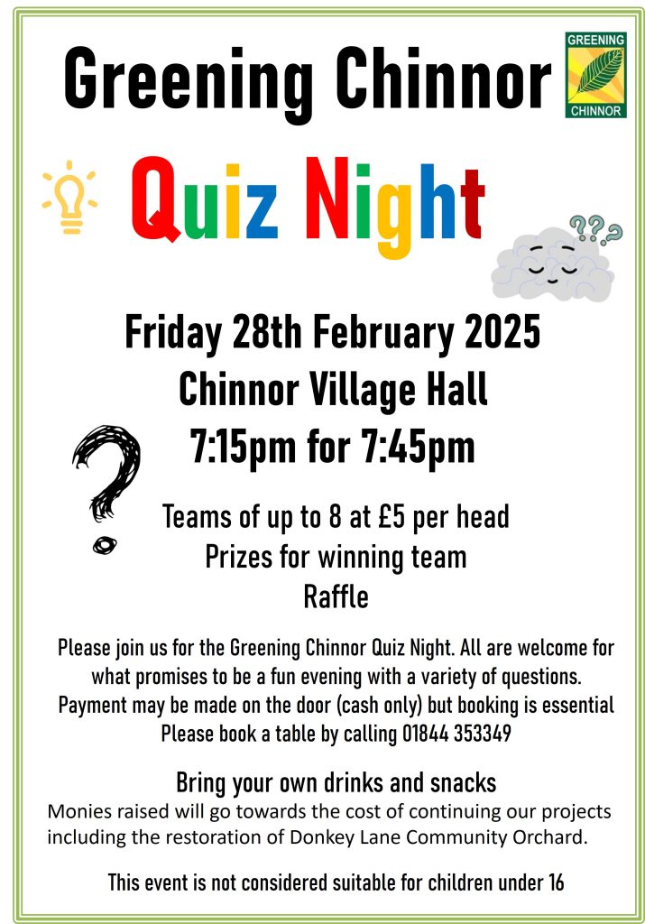 Join us at our next Quiz night, which will be held on Friday February 28th 2025 at Chinnor Village Hall. Doors open 7:15 pm, first question 7:45 pm.