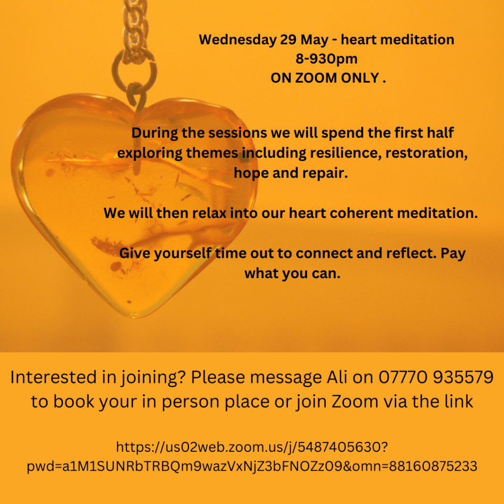 During the sessions we will spend the first half exploring themes including resilience, restoration, hope and repair. We will then relax into our heart coherent meditation.