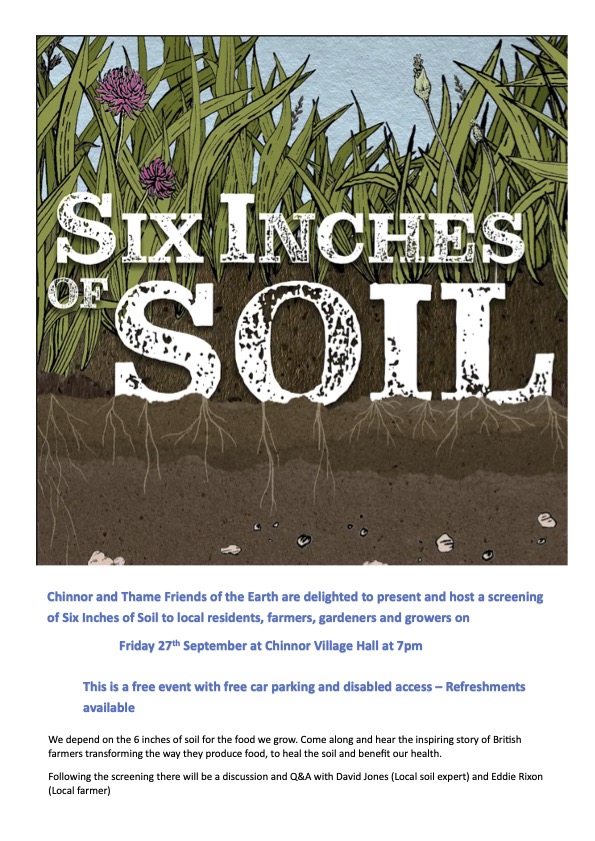 Chinnor and Thame Friends of the Earth are delighted to present and host a screening of Six Inches of Soil to local residents, farmers, gardeners and growers. Come along and hear the inspiring story of British farmers transforming the way they produce food, to heal the soil and benefit our health.